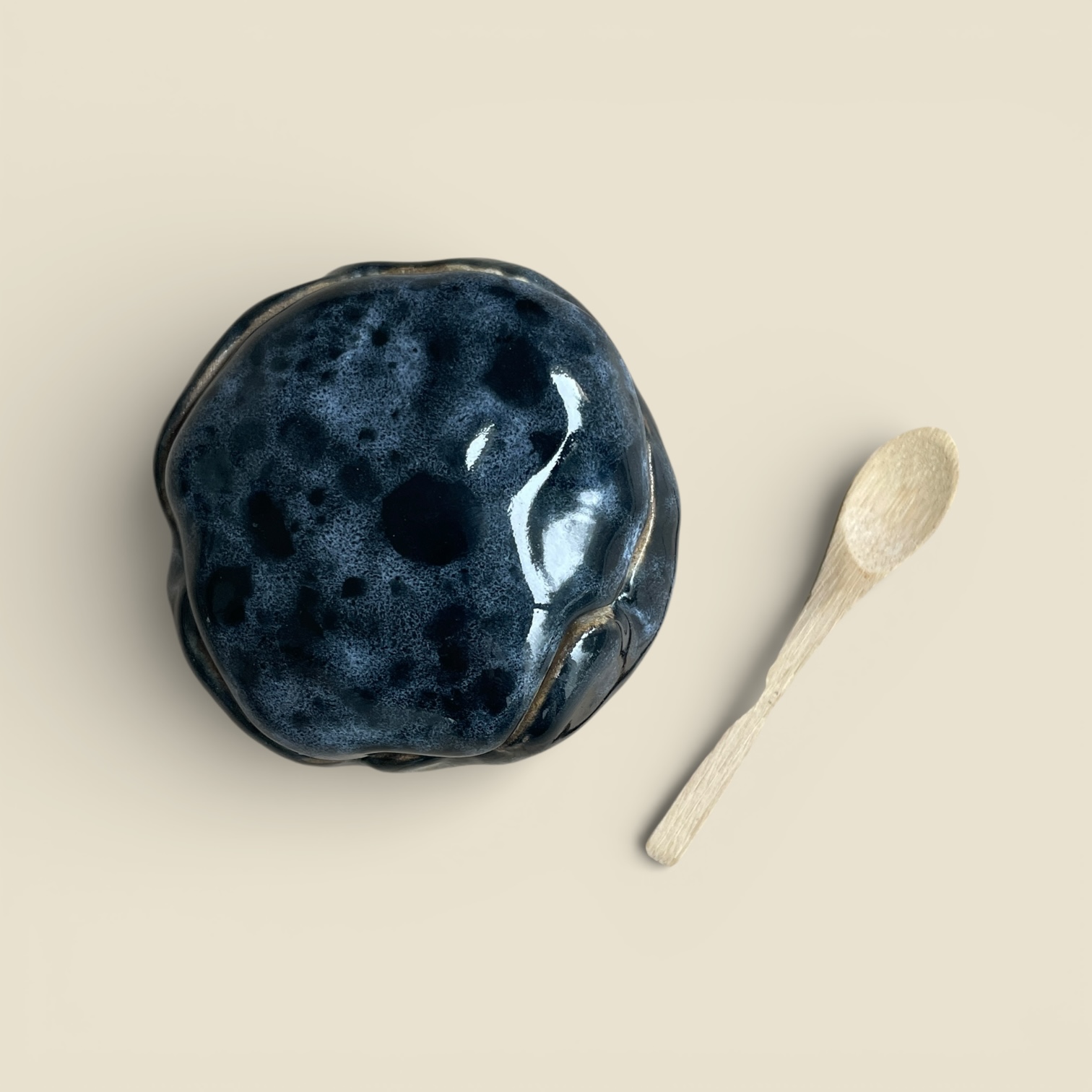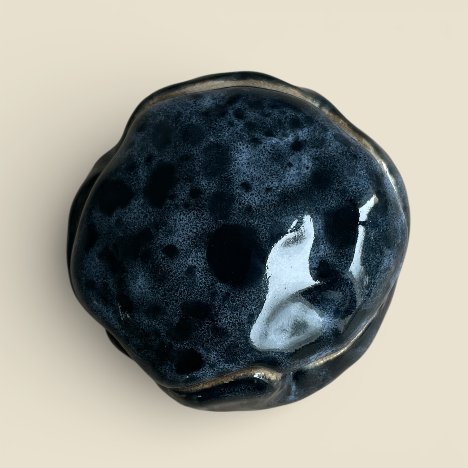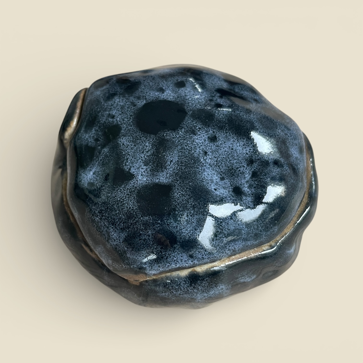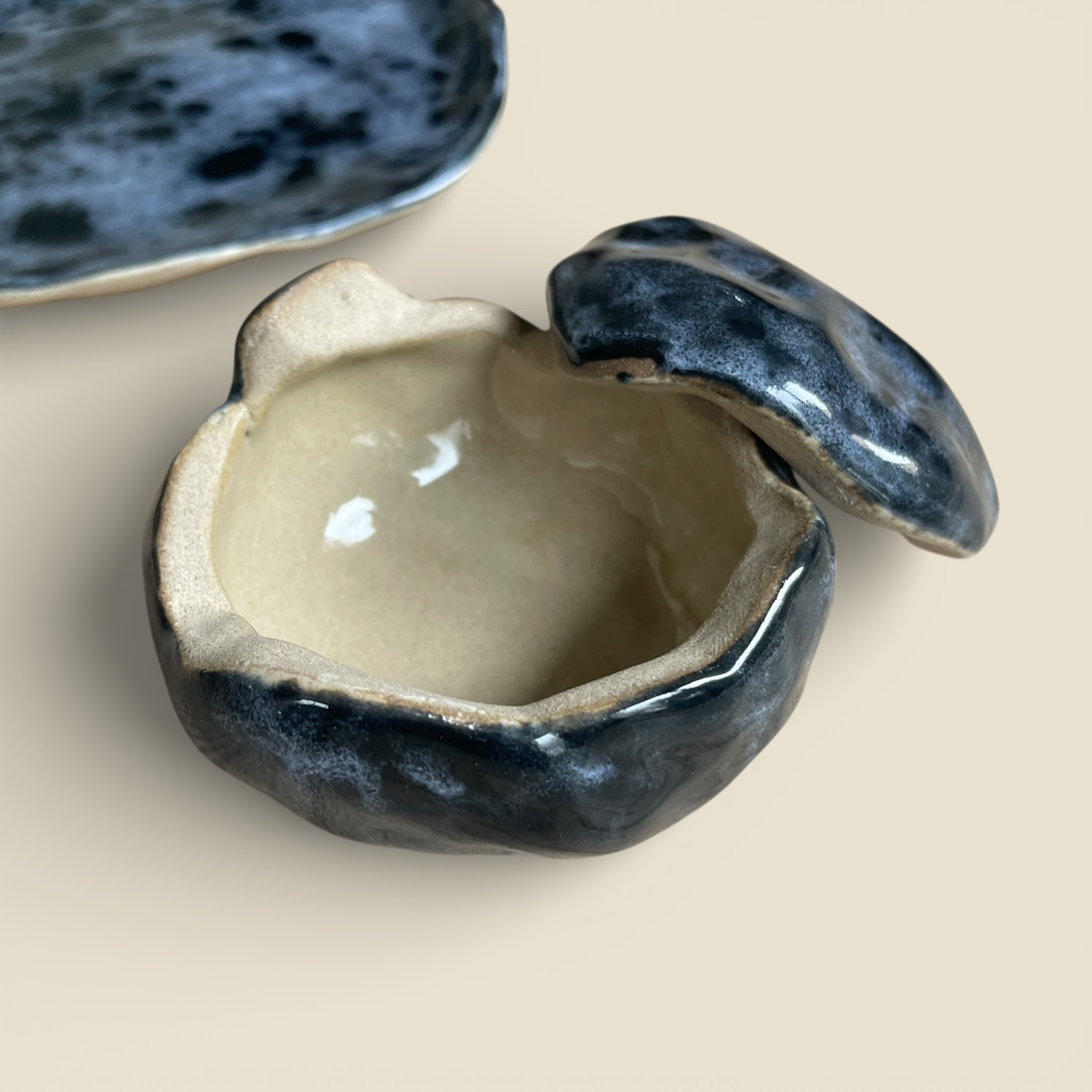 En grès brut, intérieur émaillée bleu profond et écume