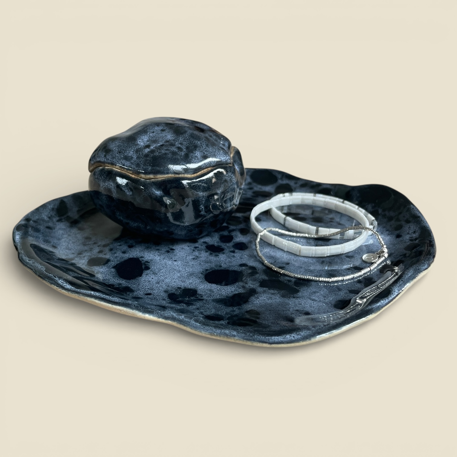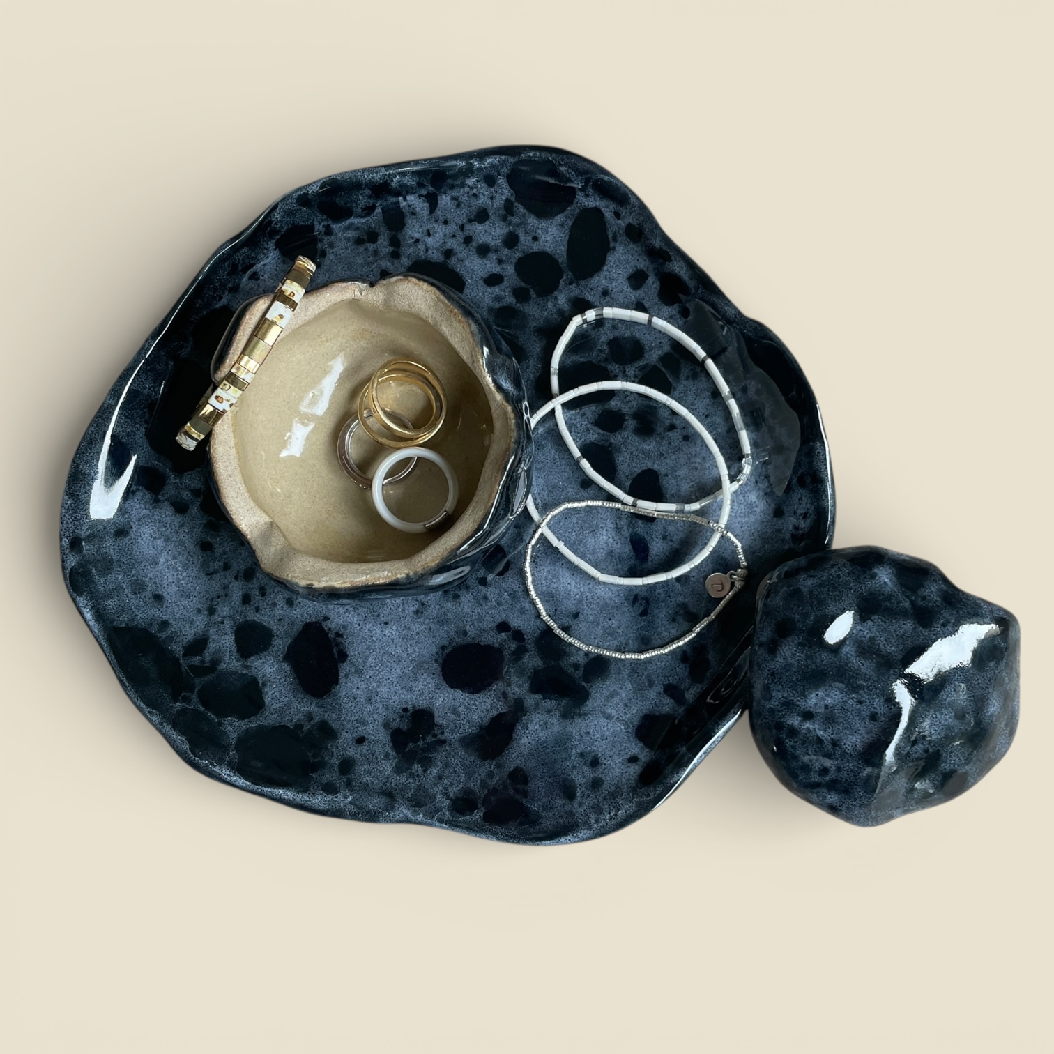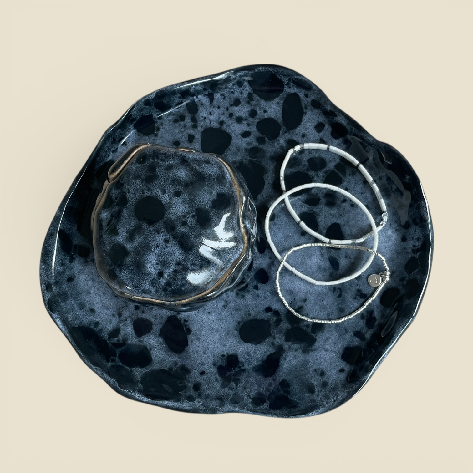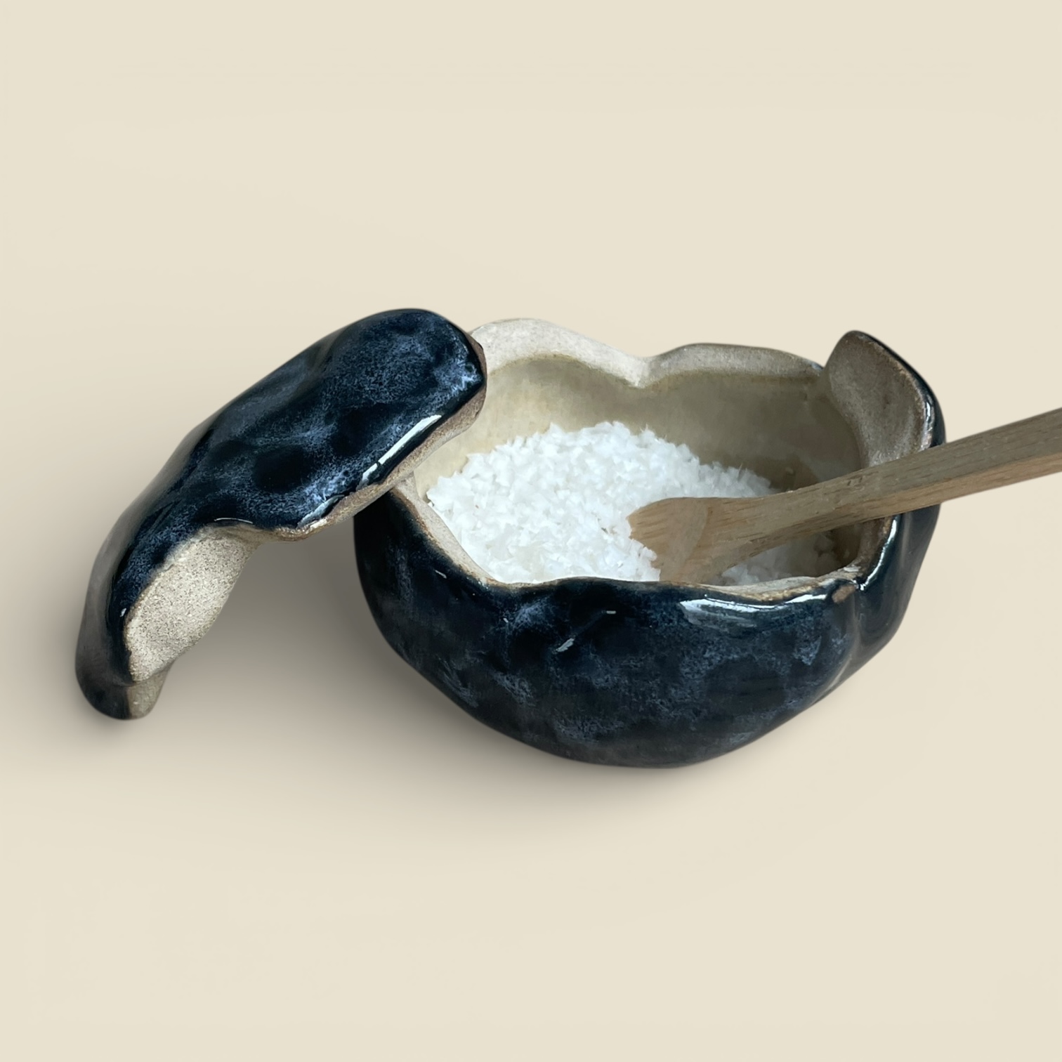 En grès brut, intérieur émaillée bleu profond et écume