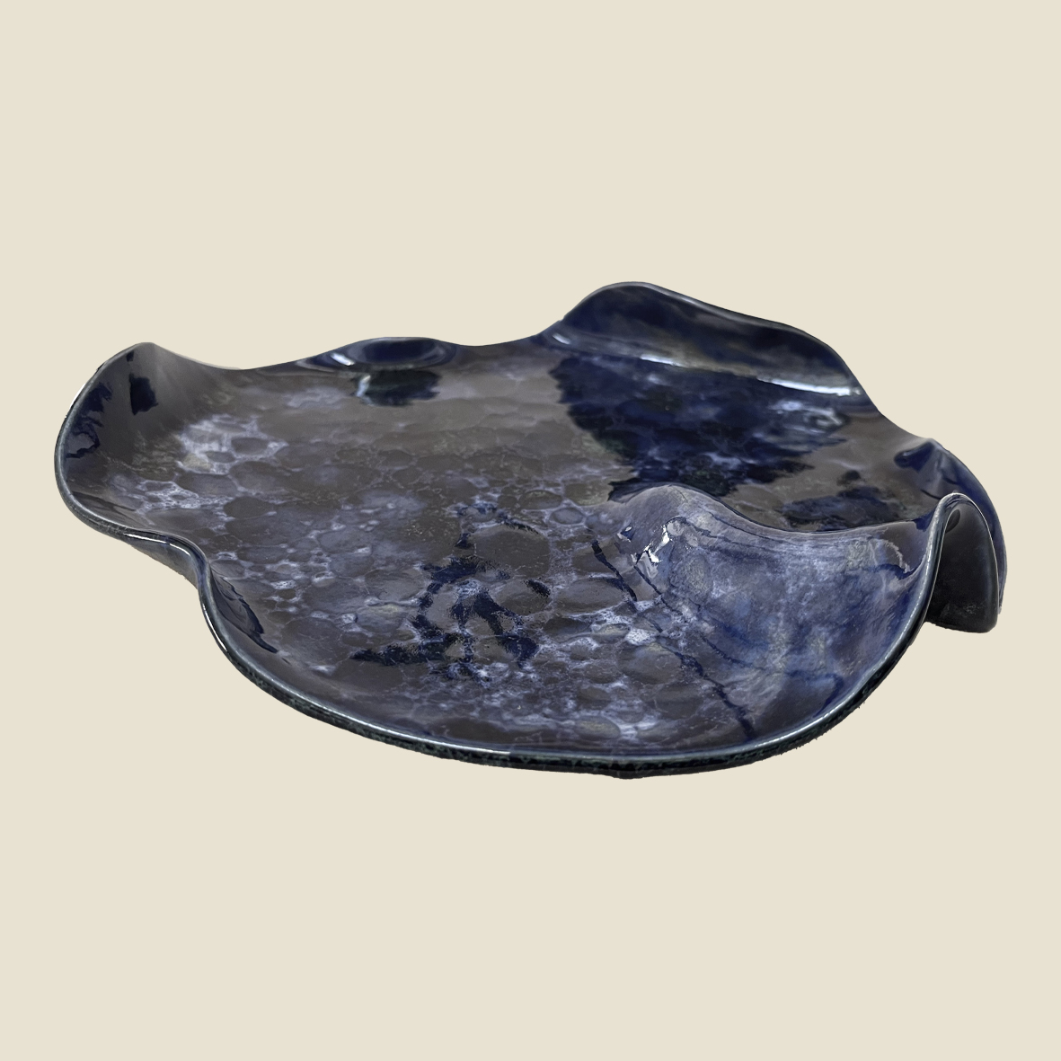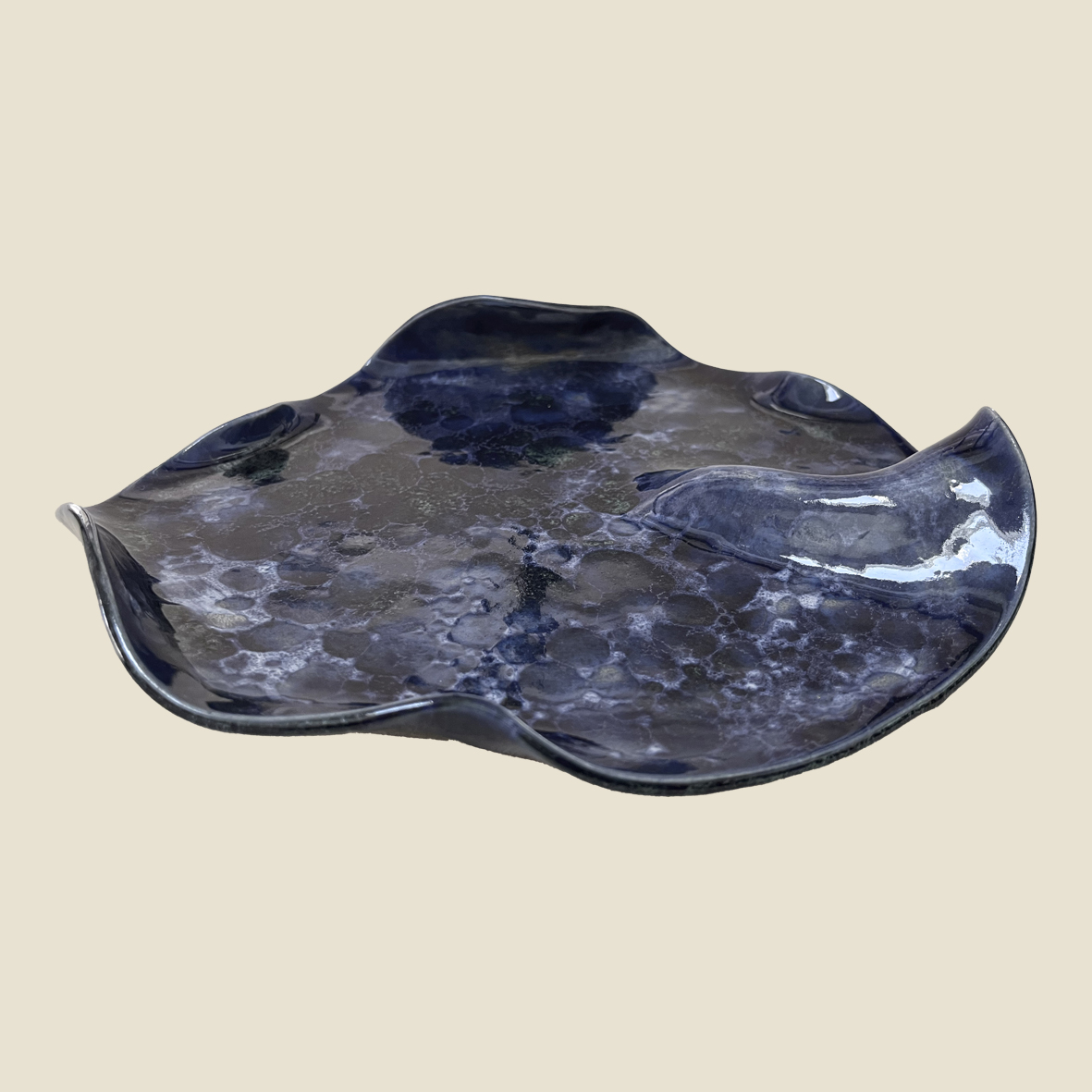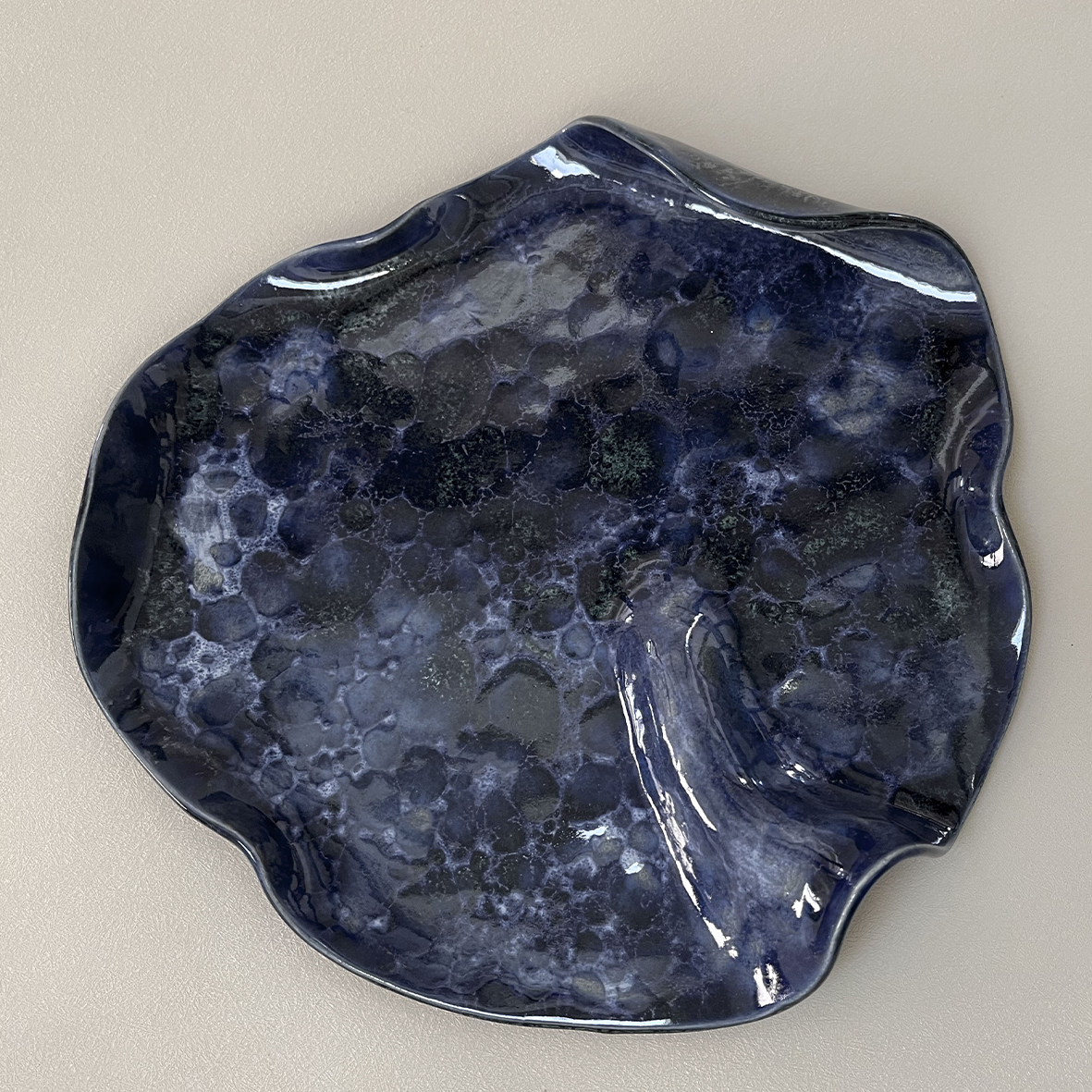 Plat de présentation de la collection « Écume » pour l’apéritif, les tapas ou le fromage. Émail bleu profond / écume bleue.