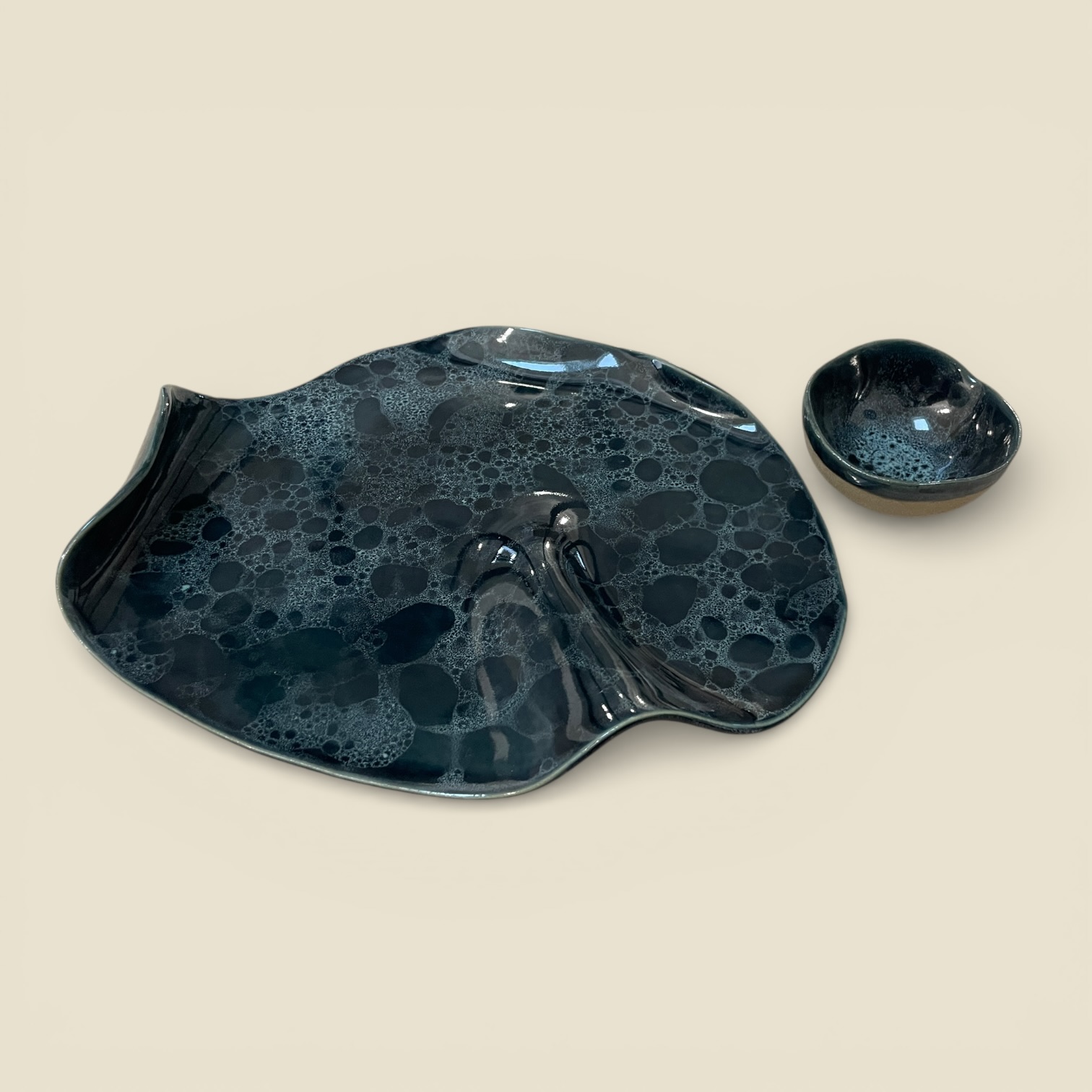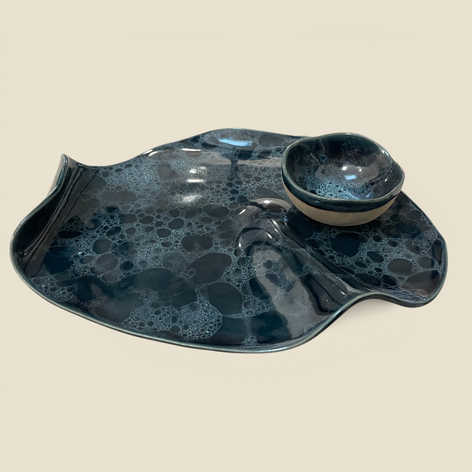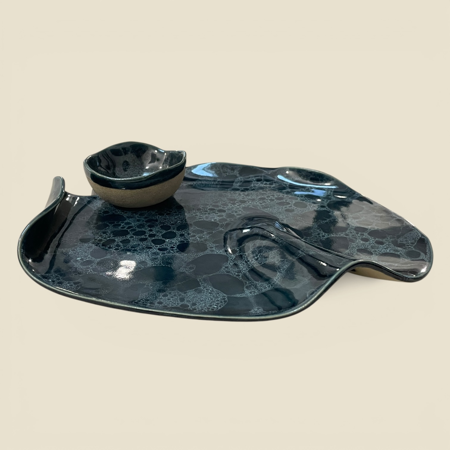 Plat de présentation et son ramequin assorti de la collection « Écume » pour l’apéritif, les tapas ou le fromage. Émail bleu profond / écume bleue.