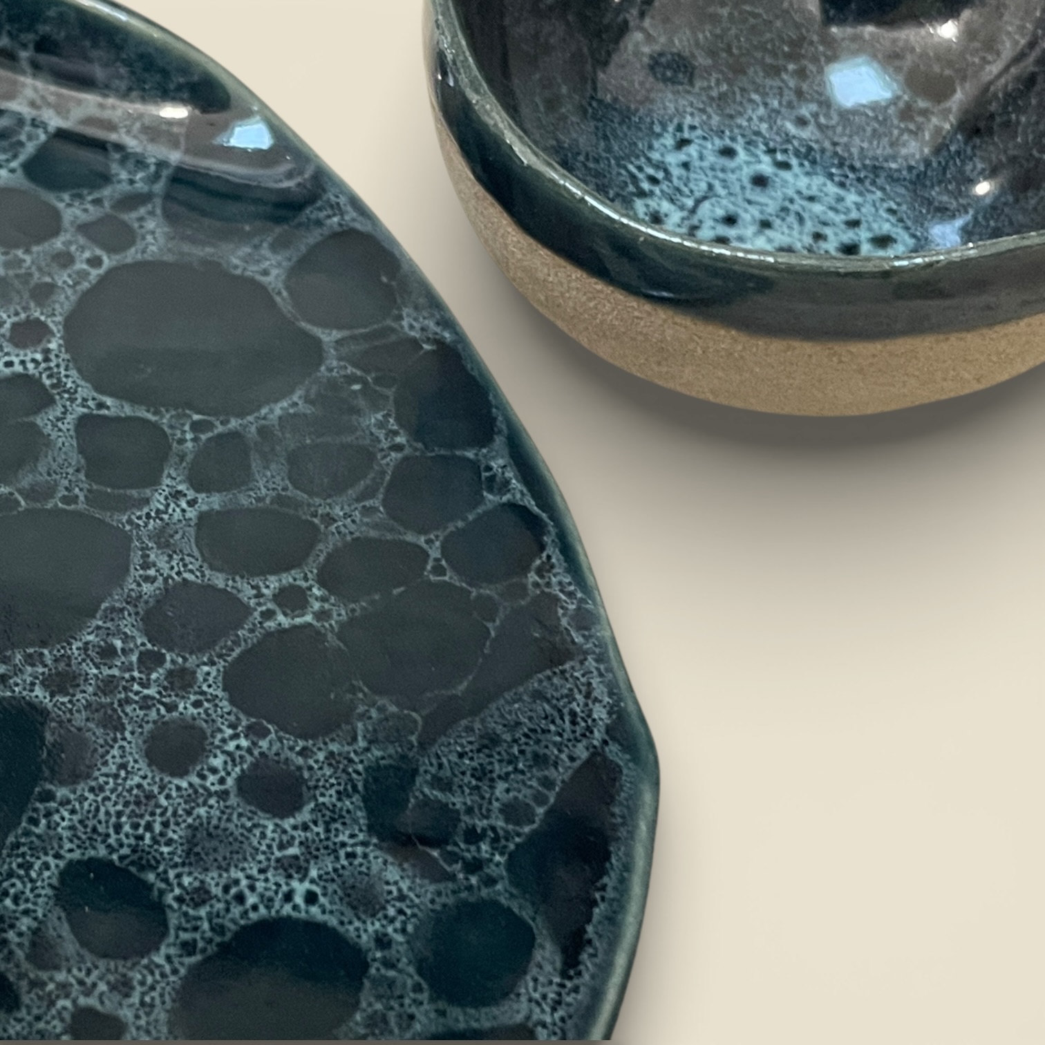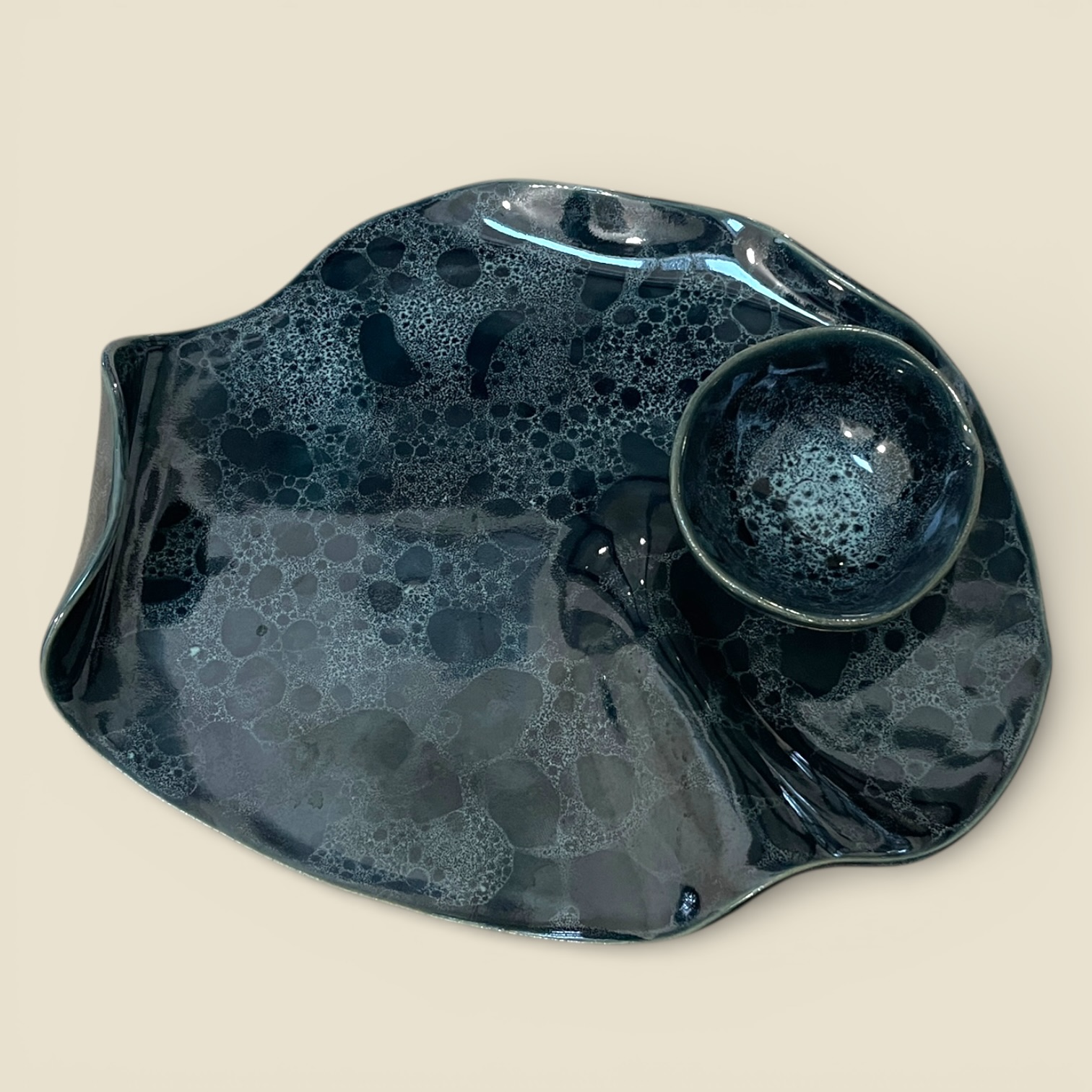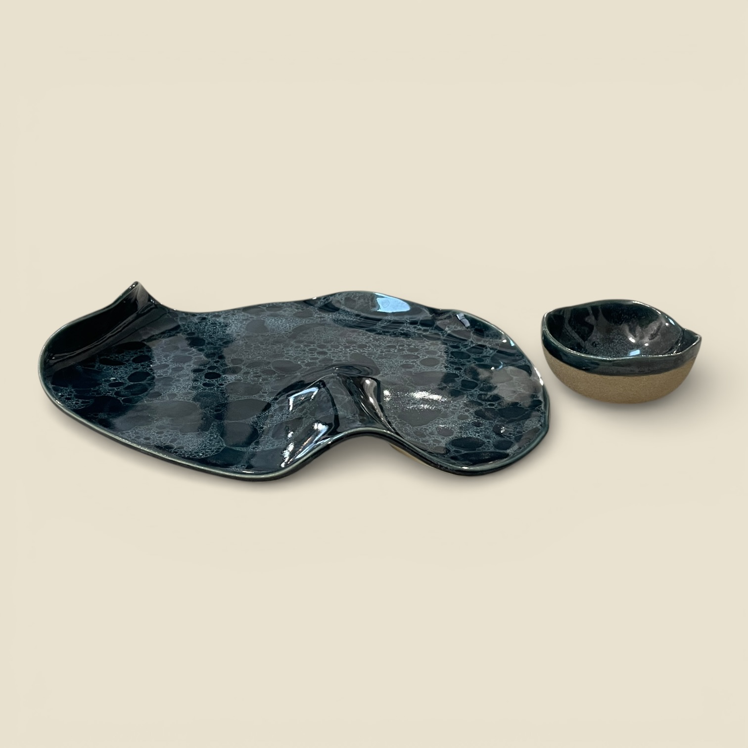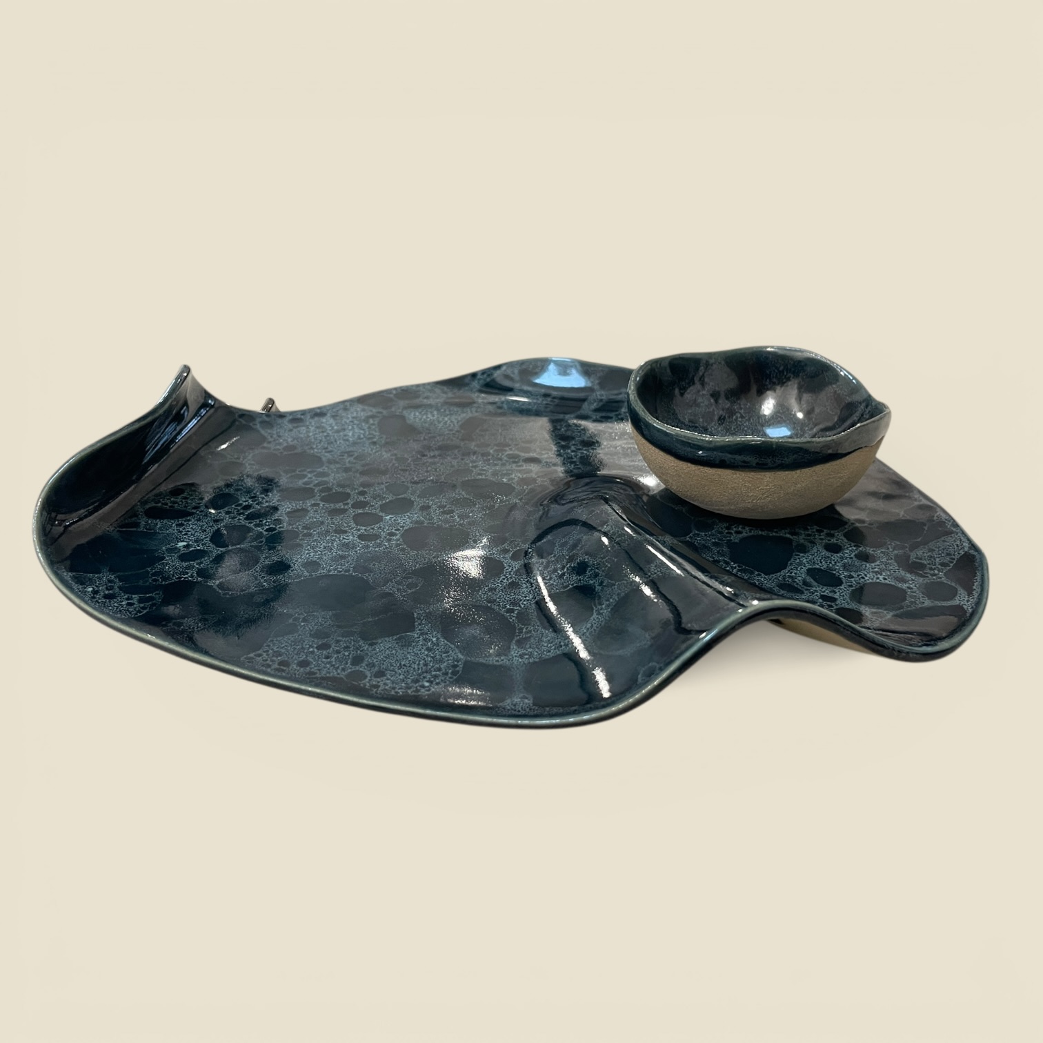 Plat de présentation et son ramequin assorti de la collection « Écume » pour l’apéritif, les tapas ou le fromage. Émail bleu profond / écume bleue.