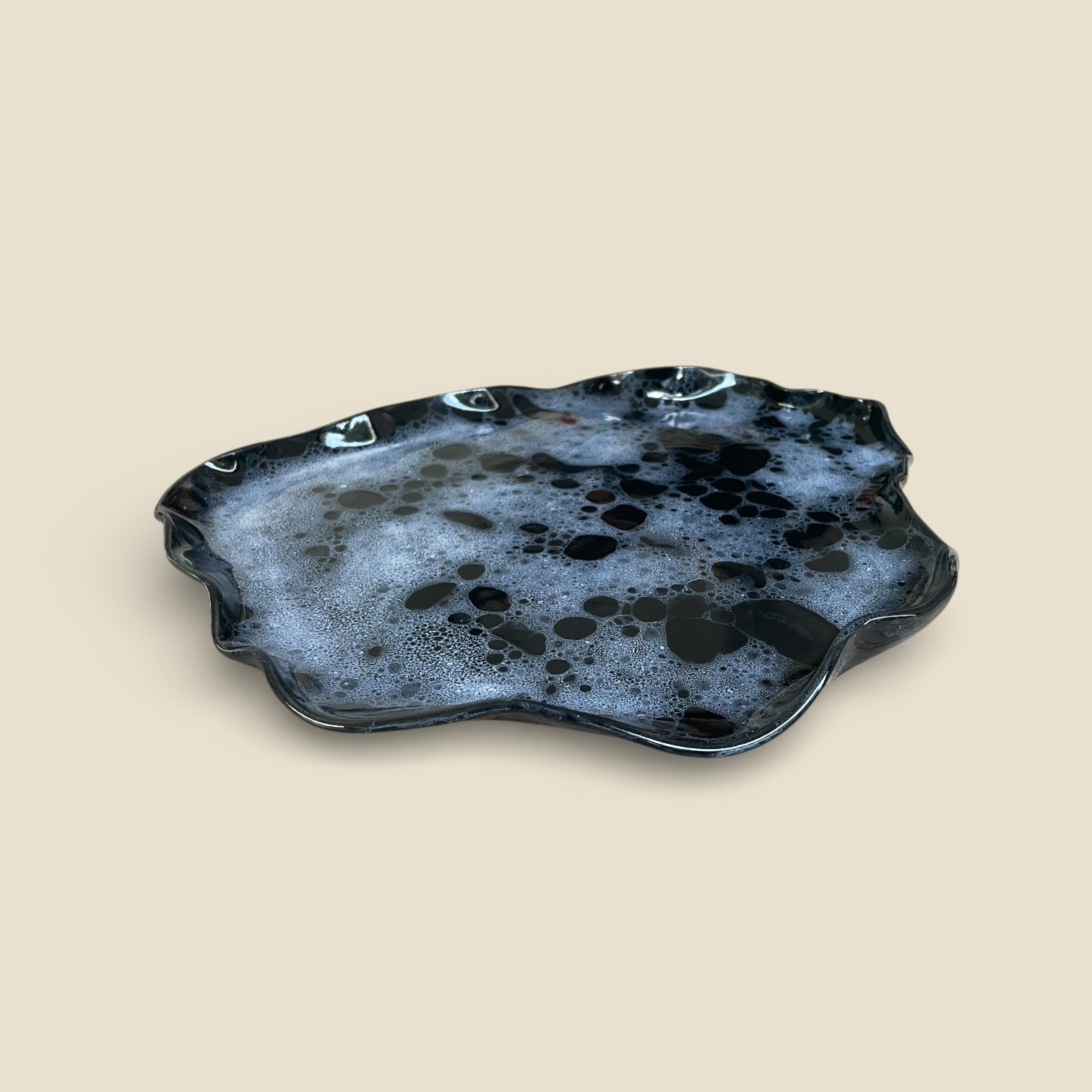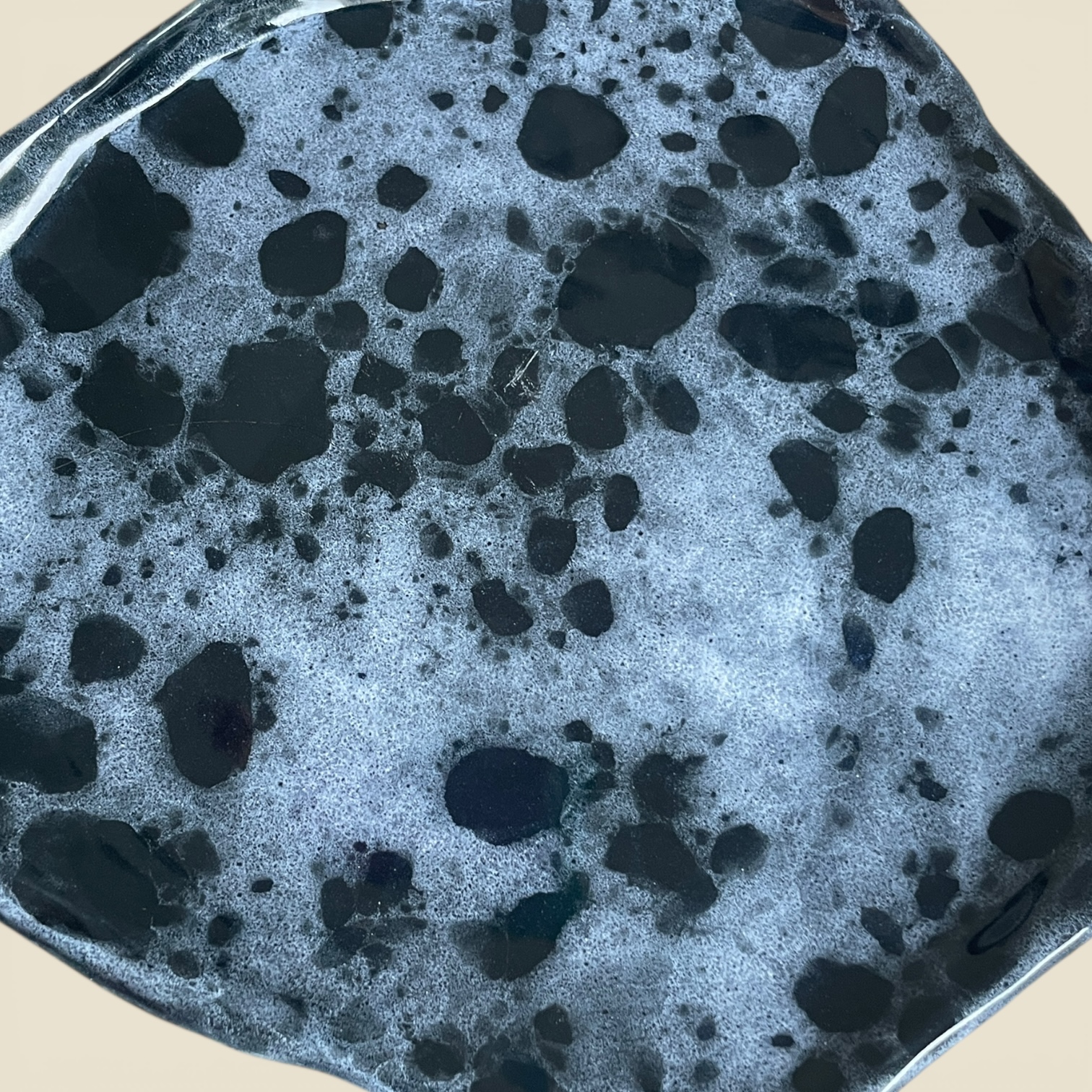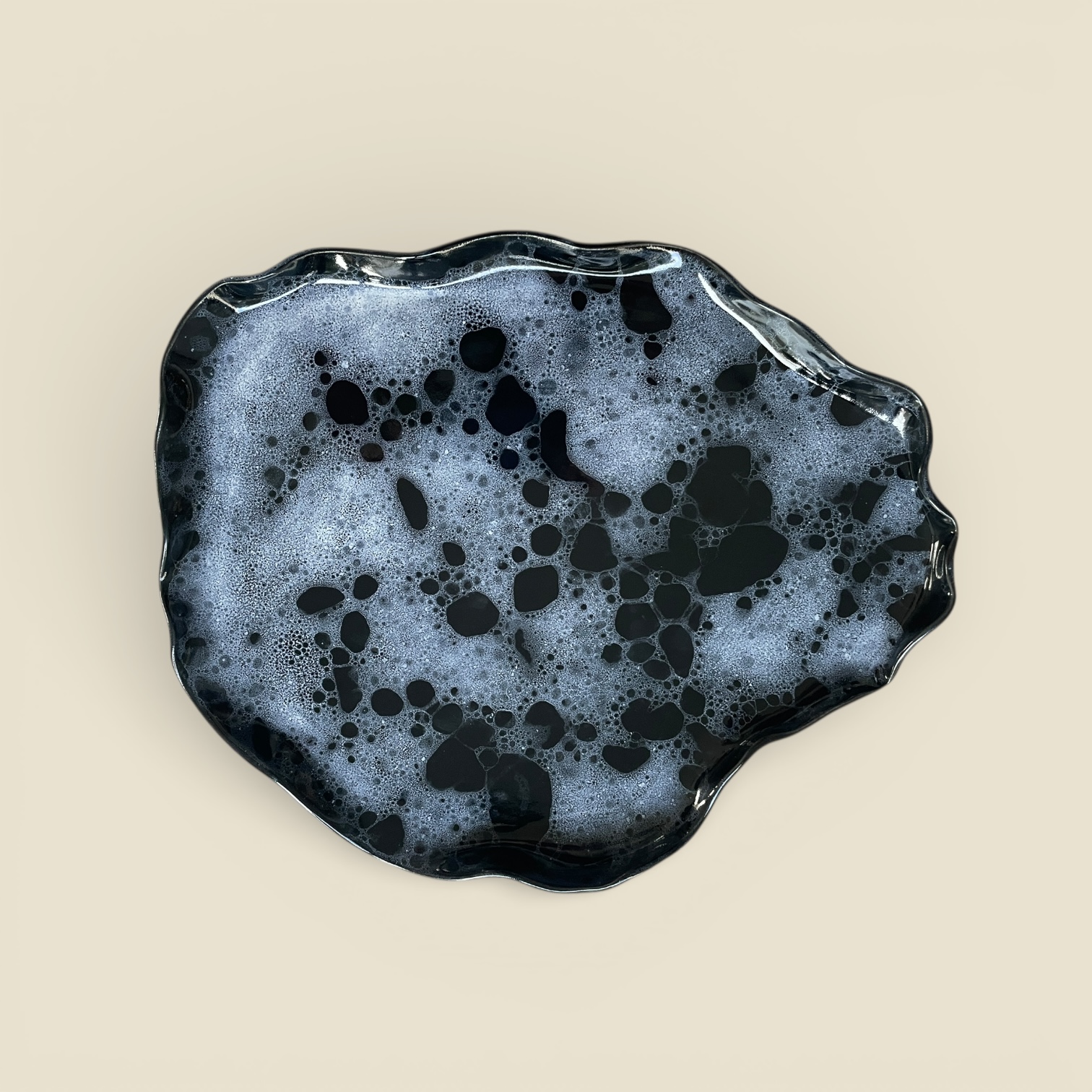 Plat de présentation de la collection « Écume » pour l’apéritif, les tapas ou le fromage. Émail noir /écume blanche. Produit alimentaire / Lave-vaisselle OK / Nous recommandons un lavage à la main afin de préserver l’émail. Micro-ondes OK – Dimensions : Largeur 31 cm / Longueur 38 cm / Hauteur 4 cm environ
