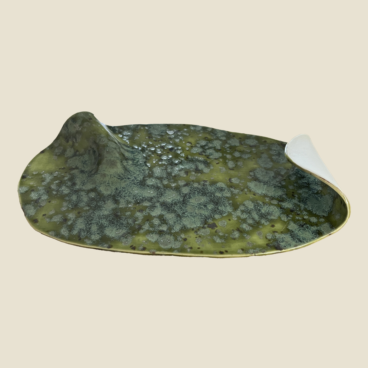 UN ADORABLE PETI PLAT de la collection « Chlorophylle » Terre Faïence, émail dégradé vert tendre / marron glacé