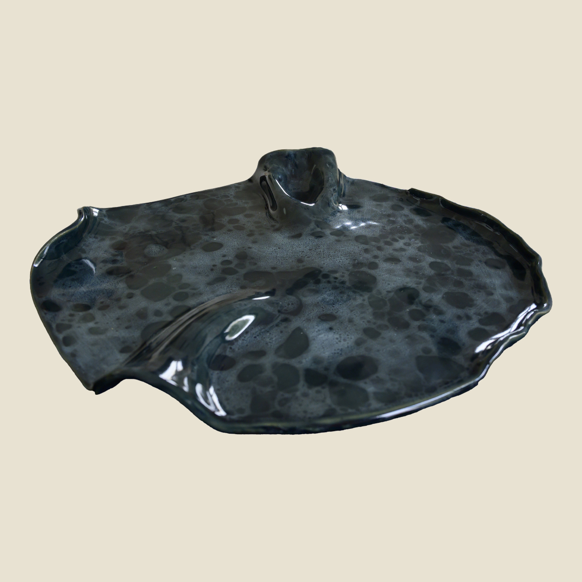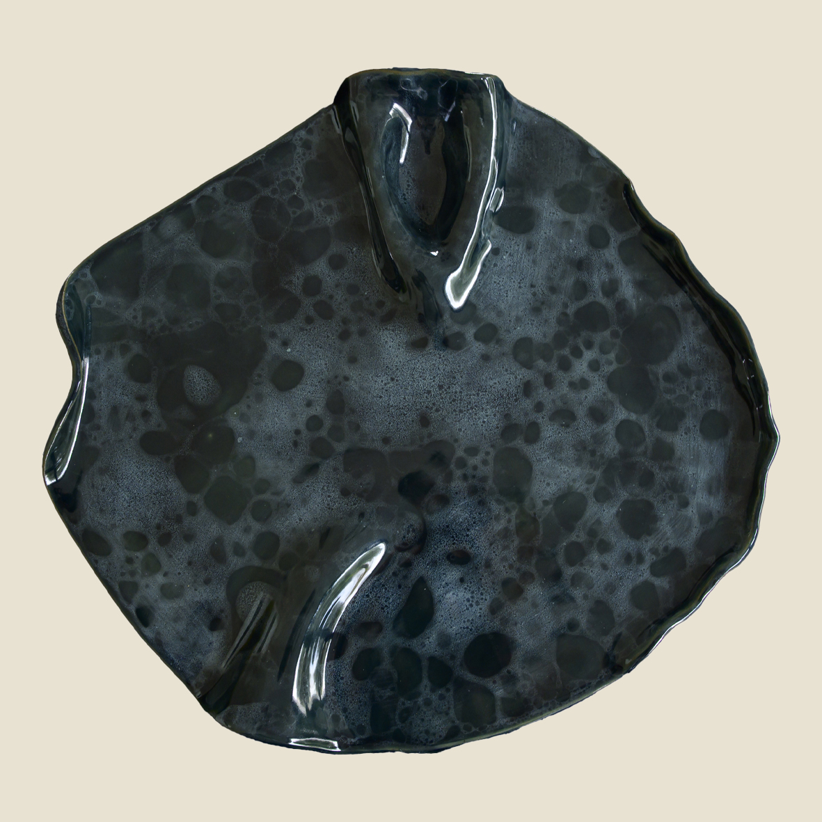 Plat de présentation de la collection « Écume » pour l’apéritif, les tapas ou le fromage. Émail bleu profond / écume bleue.